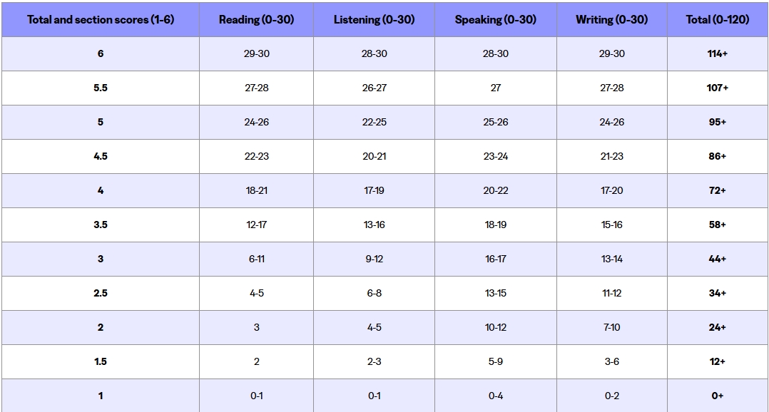 In the table above, scores from 1 to 6 (in increments of 0.5) correspond to a range of scores on a scale from 0 to 120 – for example, a 5 on the TOEFL iBT corresponds to a score of 95 and above (up to 106).