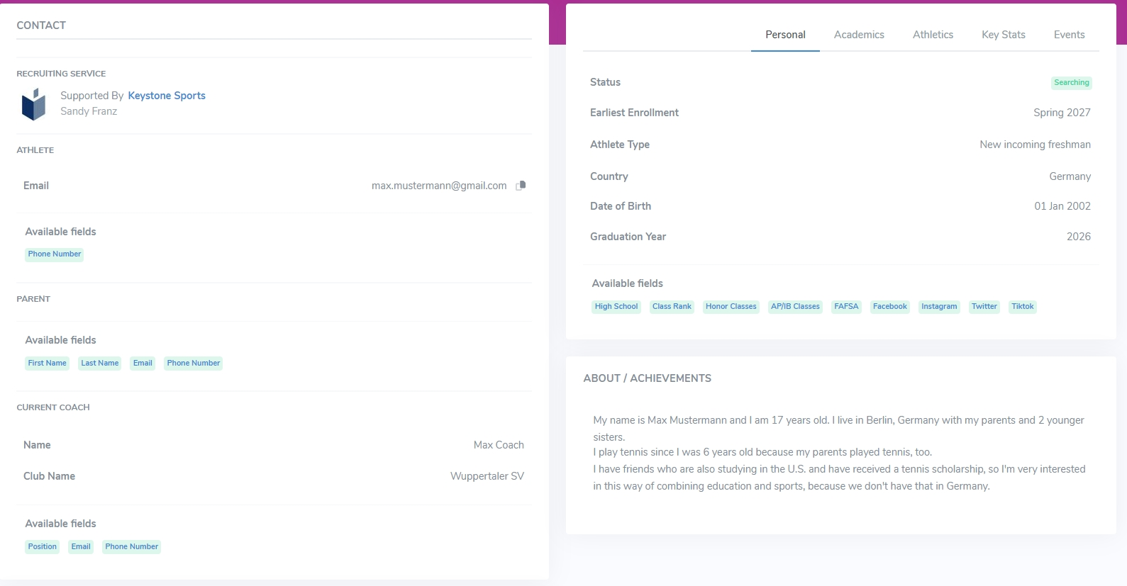 Dentro del menú “Profiles” podréis completar el perfil que utilizamos para presentar al estudiante a las universidades y entrenadores en EE. UU.
